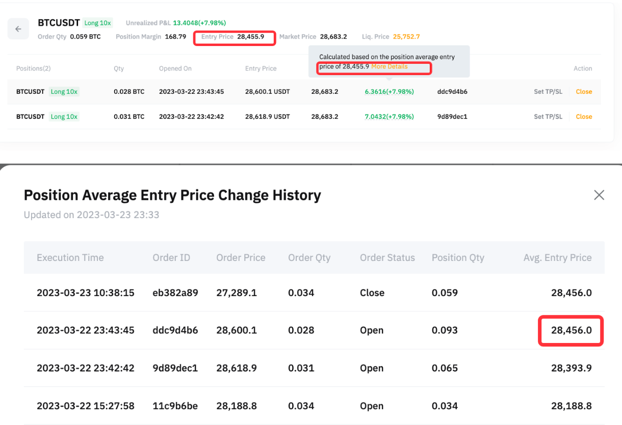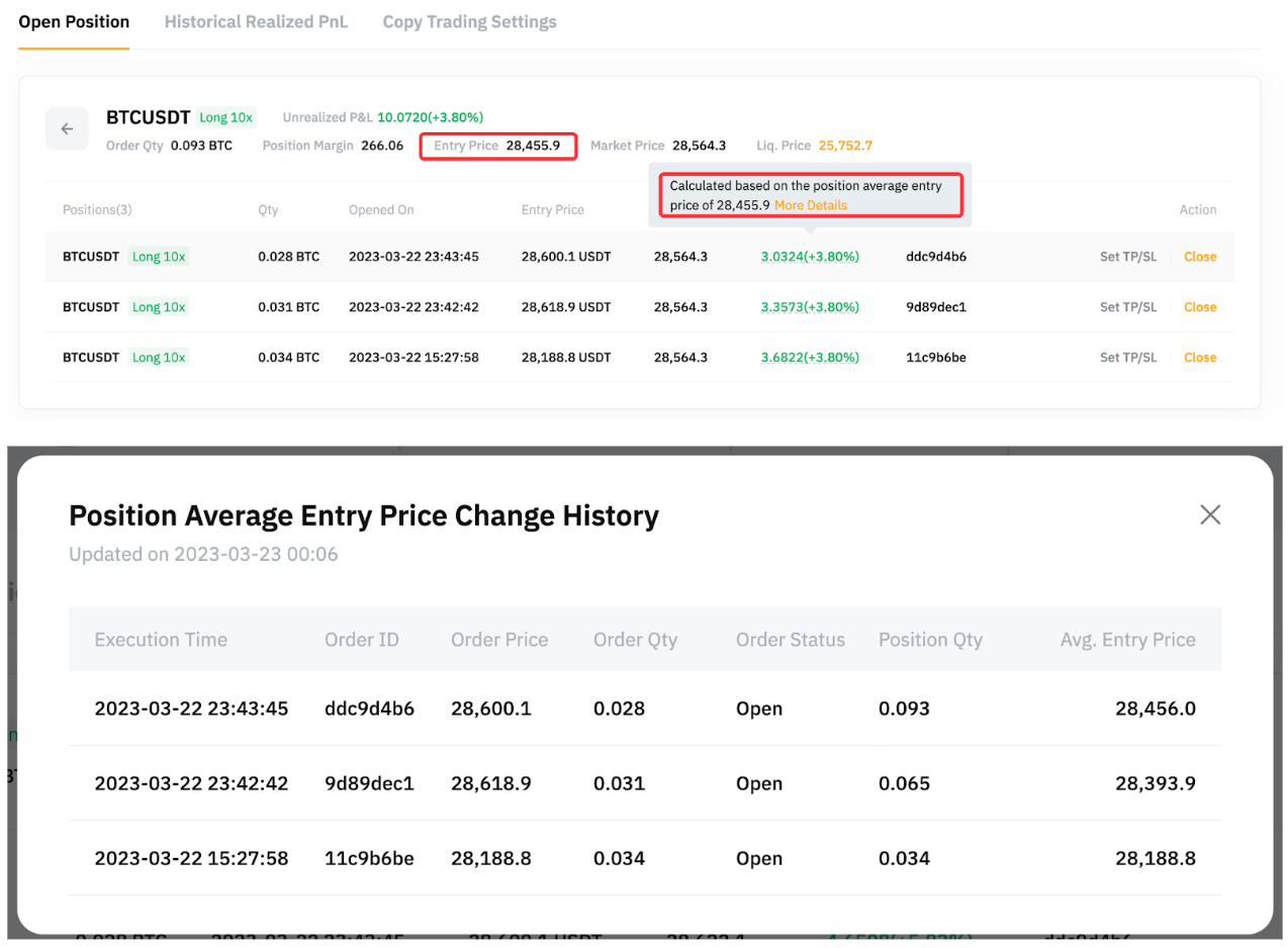 Before we go into details on Copy Trading P&L calculation, we must first understand the mechanism of USDT Perpetual Trading. When a few orders are in the same symbols with the same direction, the orders will be merged into one position, even when they open at different timings. Hence, the system will calculate the average entry price (AEP) based on the entry price of all orders for the position and also the liquidation price.