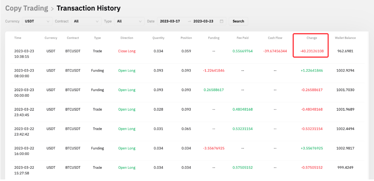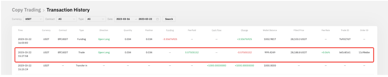 Master Trader B has partially closed the position, and so has the position of Follower A. Follower A can see a total of –40.23126108 USDT has been deducted from his wallet balance, which includes the position loss of -39.67456344 USDT for that 0.034 quantity of BTCUSDT long order and also a trading fee of 0.55669764 USDT to close that order.