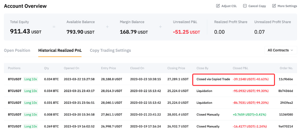 From the Historical Realized P&L page, we can see the order is closed via copied trade with a closed P&L of -39.1548 USDT.