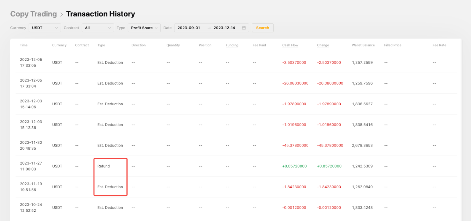 — As a follower, you will see the Est. Deduction is the profit share being pre-deducted from your earned profit. On the profit share settlement date, if there’s a net loss in the total P&L, the pre-deducted profit share will be sent to your Funding Account as a Refund on the settlement day. For more information, please refer to Copy Trading: Profit Sharing Explained.