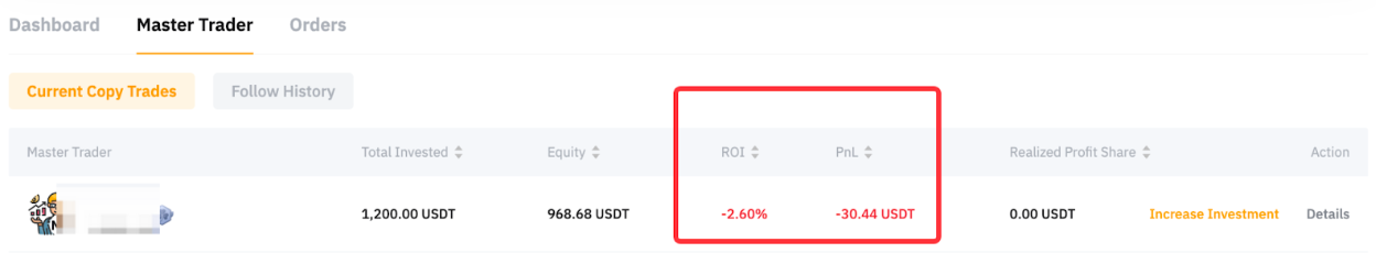 ROI = [total equity - (total investment + investment reduced during the copy period)]/(total investment) ROI = [968.68 - (1200 - 200)]/1200 = -2.61%