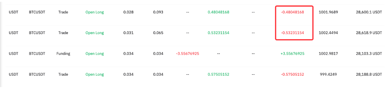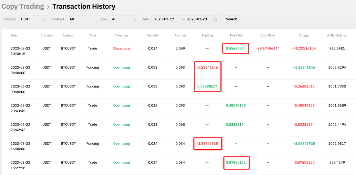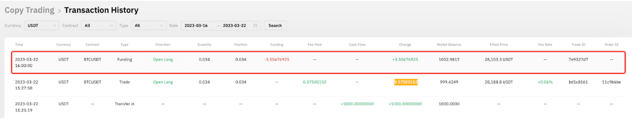 At UTC 16:00, the position is not closed and the funding fee will be incurred. From the screenshot below, we can determine the funding rate is negative, and therefore Follower A received the funding fee for his long position. 3.55676925 USDT has been added to his available balance for this Master Trader.