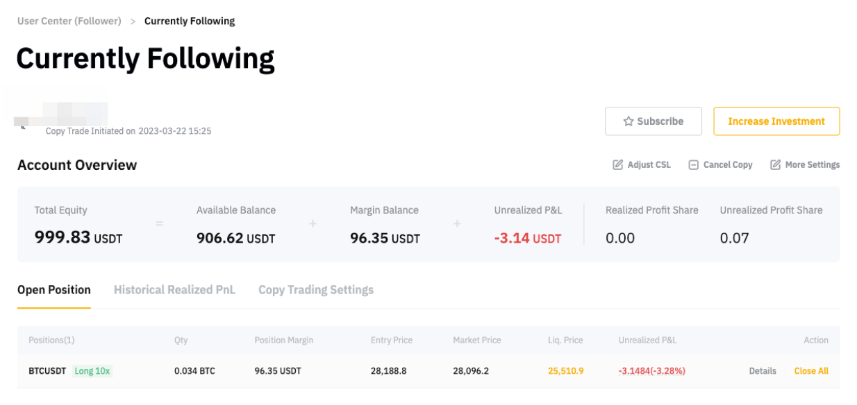 Follower A copied Master Trader B with a 1,000 USDT investment. A while later, he successfully copied a trade with this Master Trader. A 0.034 BTCUSDT long position is opened, with an order entry price of 28,188.80 USDT.