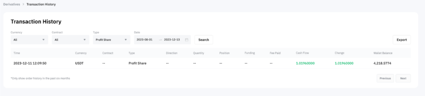 — As a Master Trader, you can see your Profit Share record from the Derivatives Account History or Unified Trading Account Transaction Log (for Master Trader upgraded to UTA).