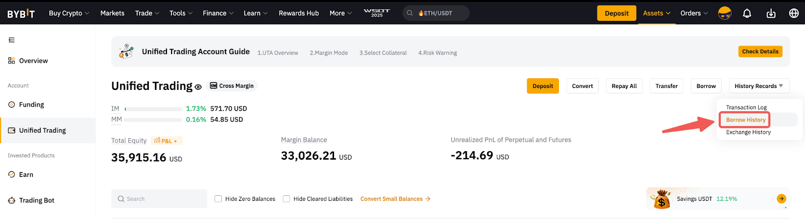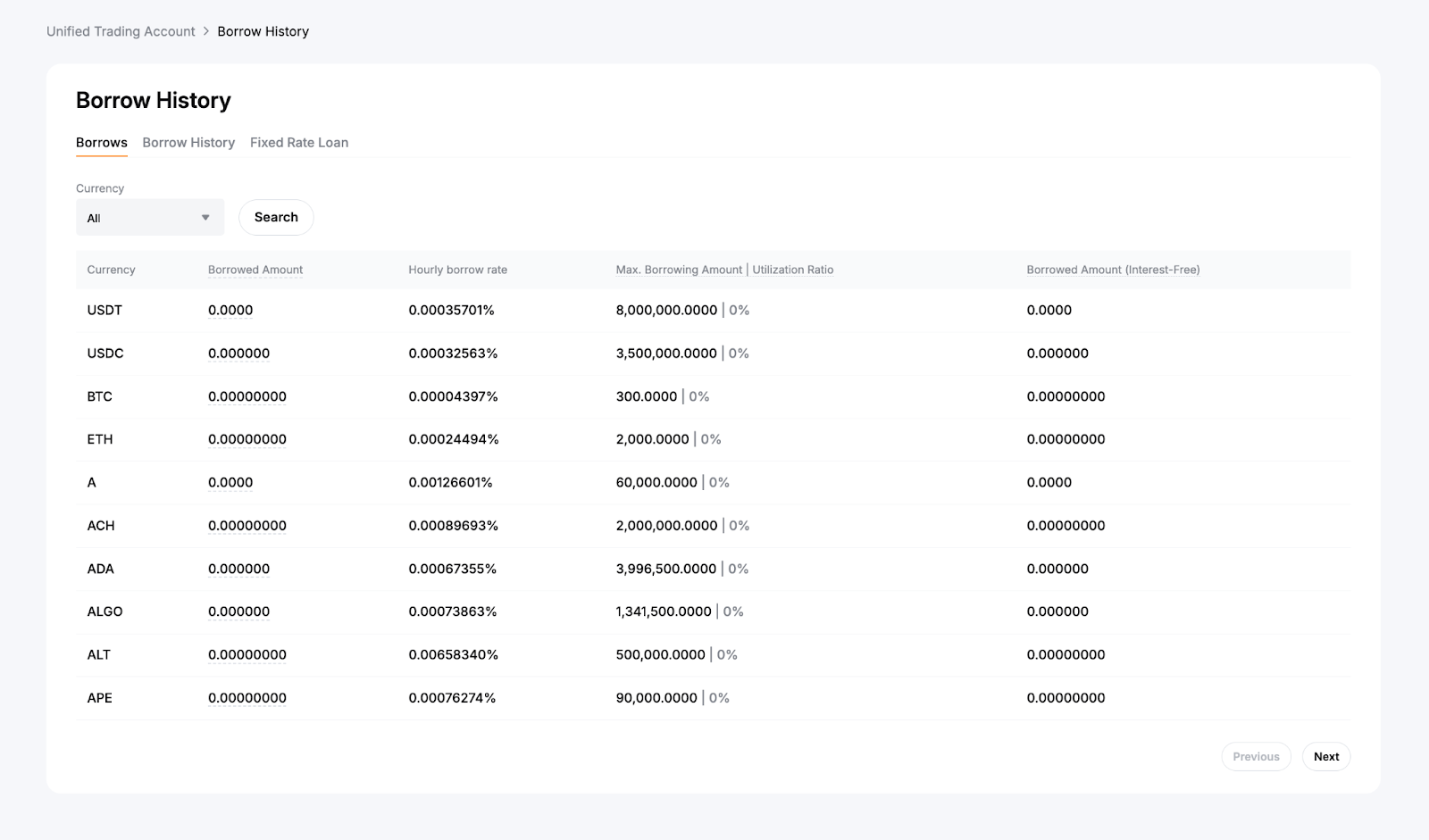 Under Borrow History, you can view borrowing details for each coin, including the total borrowed amount, hourly interest rate, maximum borrowing amount, utilization ratio and interest-free borrowed amount.