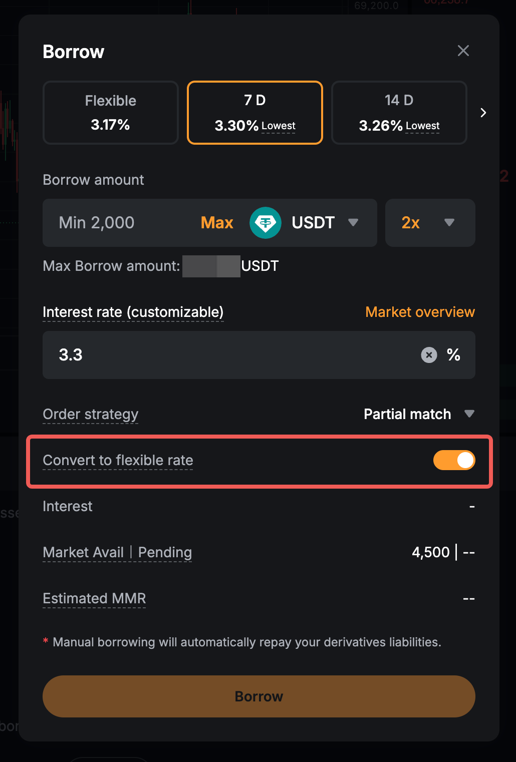 This option is available only for Fixed-term Loans. You can enable “Convert to Flexible Rate” when submitting a borrowing order. Once the order is submitted successfully, the setting cannot be modified.