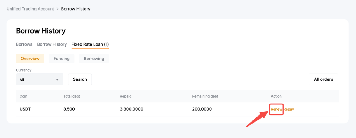 The Renew option is available for Fixed-term borrowing only. After repayment (within the loan period), you may apply to reborrow the repaid amount through the Borrowing History page. The borrowing renewal within the original loan period will not incur additional interest.