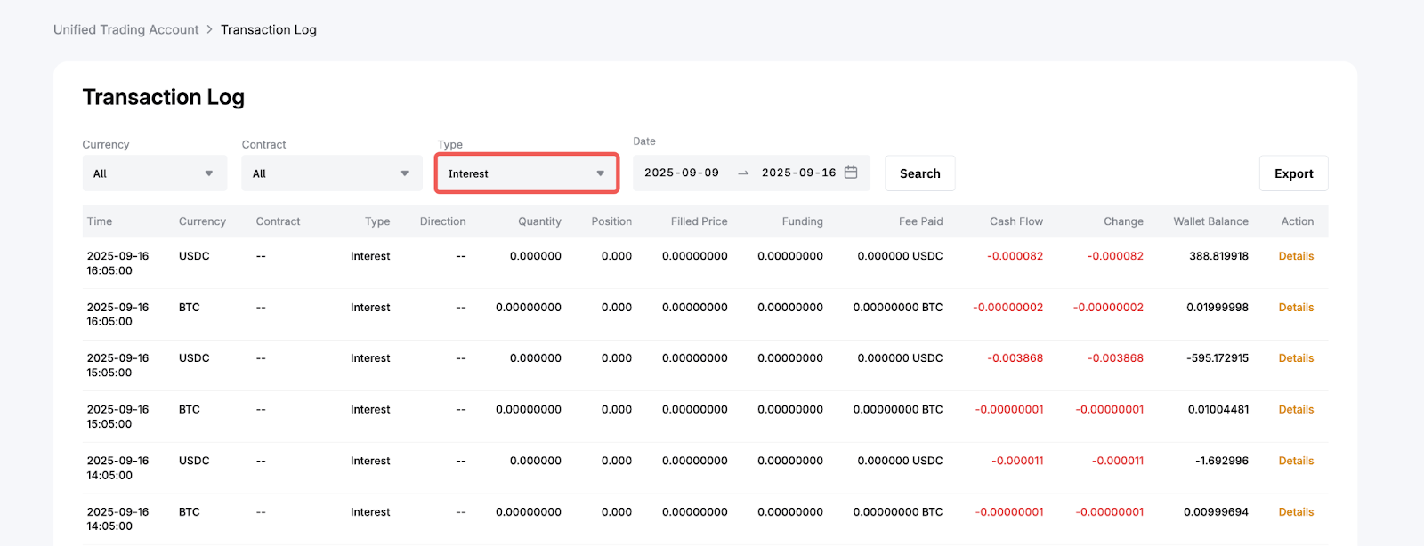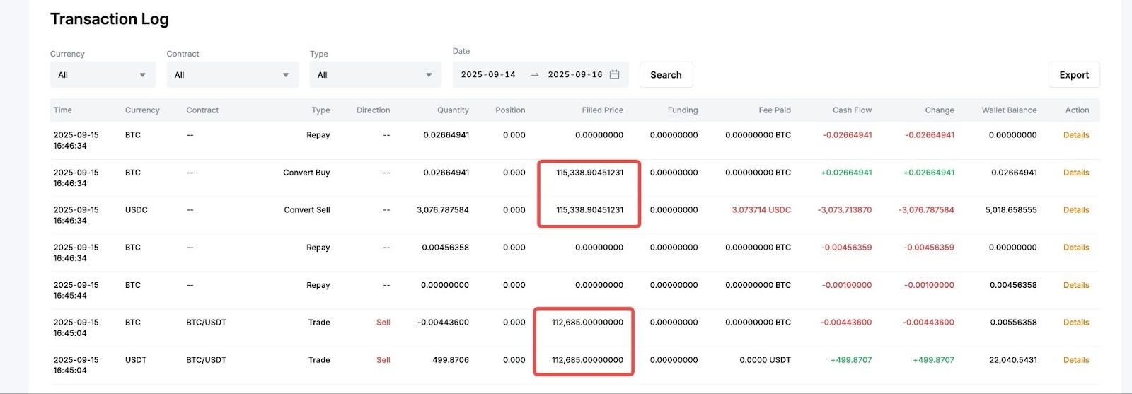 Note: When you perform any crypto-to-crypto conversion for repayment — for example, swapping USDC to BTC — you will see two transaction records. These two records will show the same filled price. The filled price displayed for exchange transactions is calculated based on the formula: (Amount Exchanged Out – Fee) / Amount Exchanged In