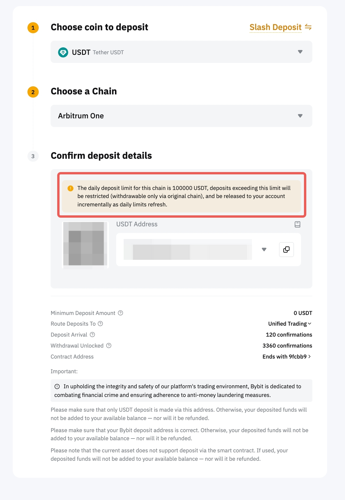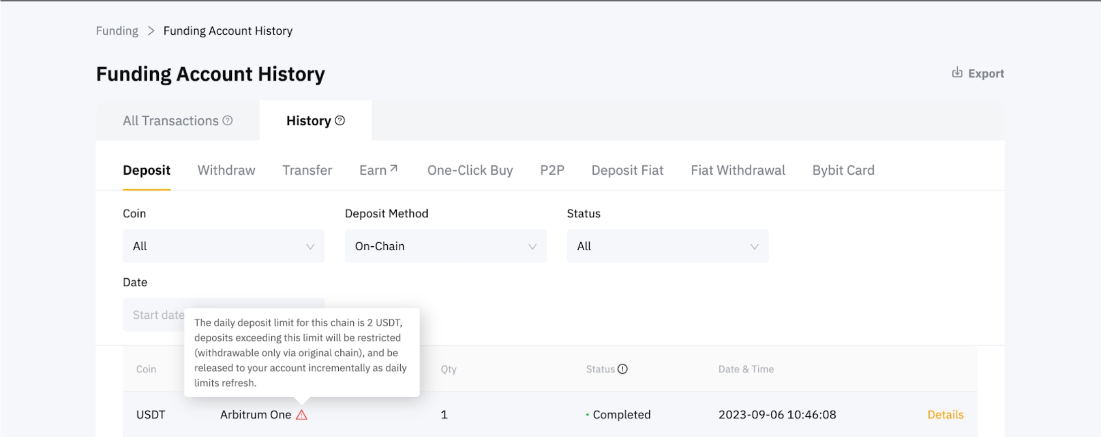 Bybit has established a daily deposit credit limit for each particular blockchain. Deposits exceeding this limit will temporarily remain as non-tradable assets and can be viewed in the Pending Assets section on the Funding Account Page.