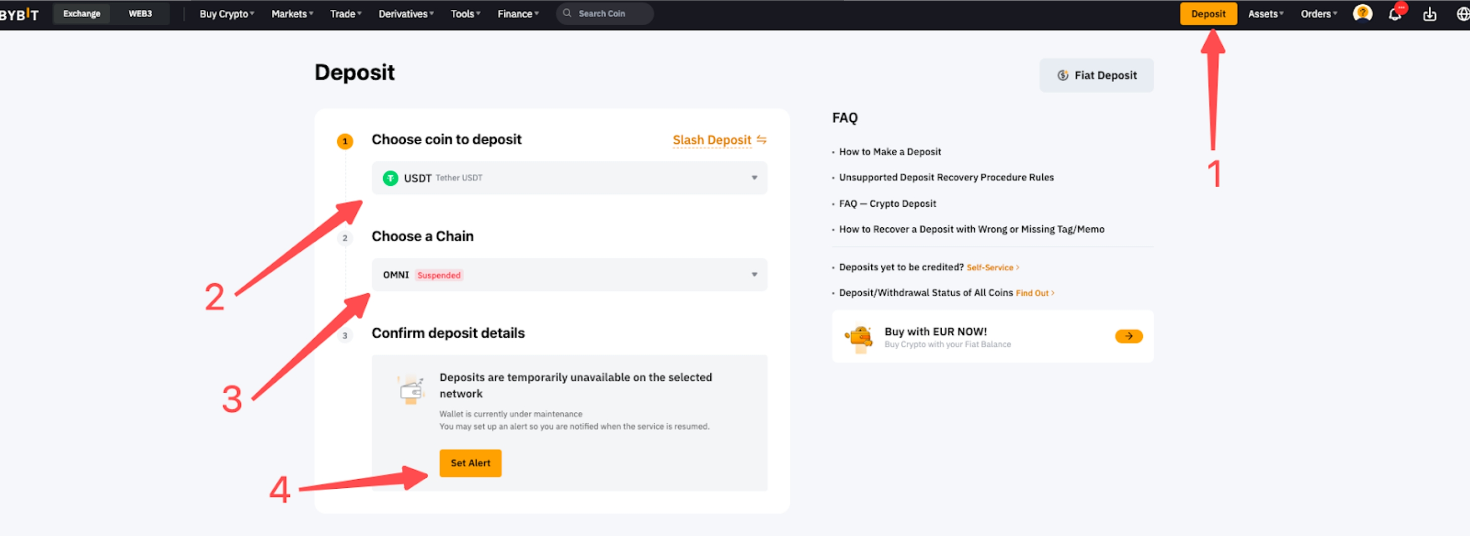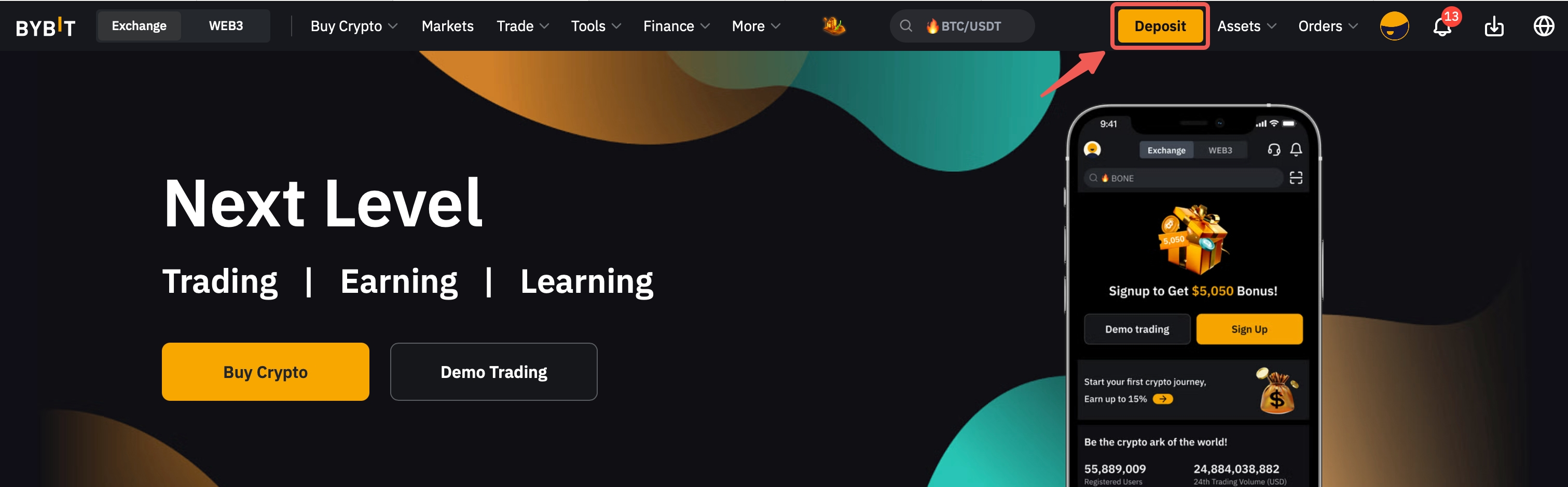 Alternatively, you can also locate the Deposit entrance in the upper right corner of the Bybit page.