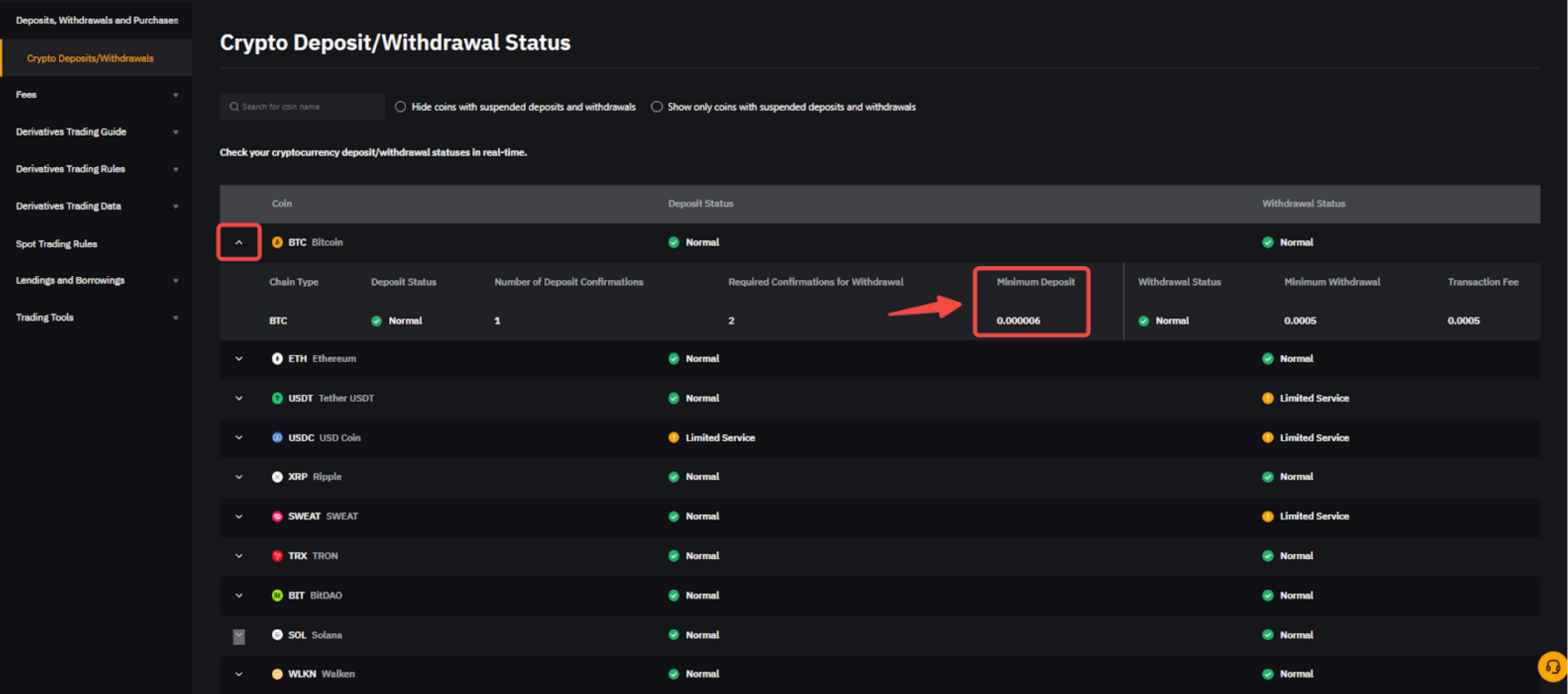 You can find the list of minimum deposit amounts for each coin on the Crypto Deposit/Withdrawal Status page. Kindly click on the dropdown button of the coin you would like to deposit or withdraw to view the deposit status for each supported chain type, as well as the necessary information to perform a successful deposit.