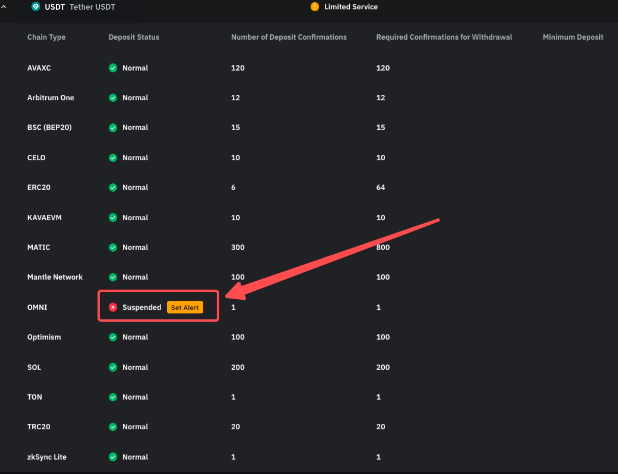 Alternatively, you can go to the Deposit/Withdrawal status page and search for the token and chain. The Set Alert button will be visible next to the “Suspended” deposit status.