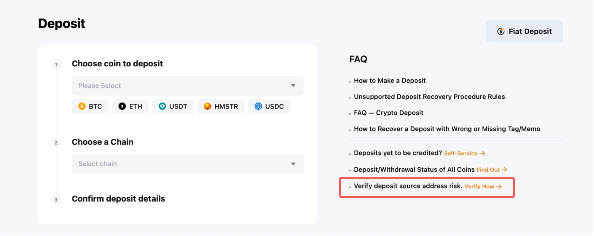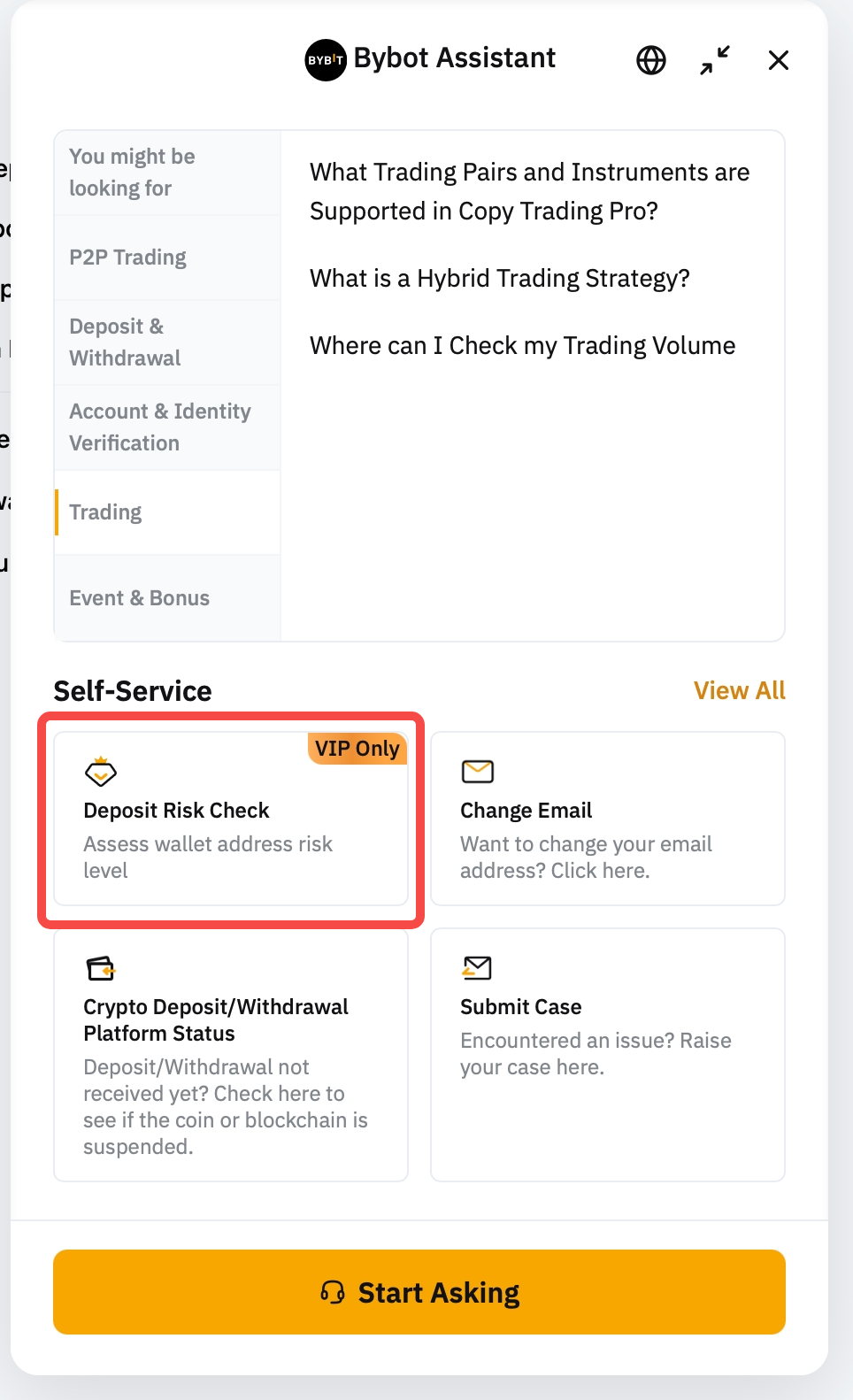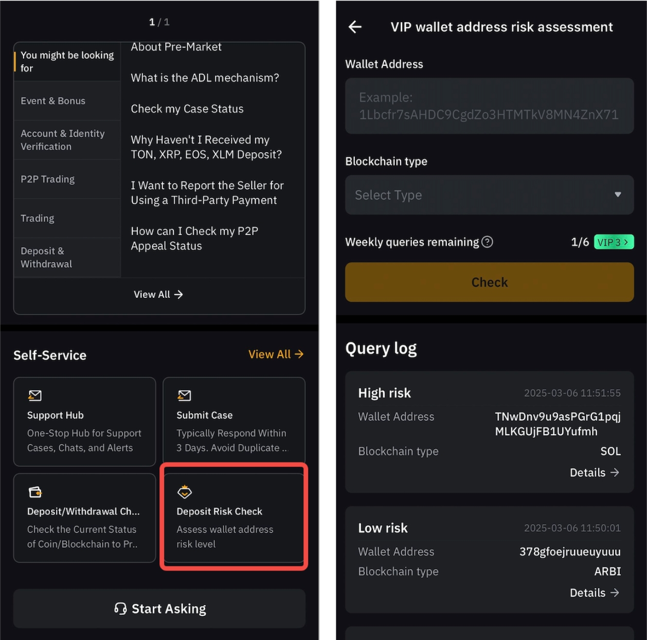 Yes, currently only VIP users can access the address risk feature via a self-service bot and the deposit page. Users can click on Verify deposit source address risk to access the page.
