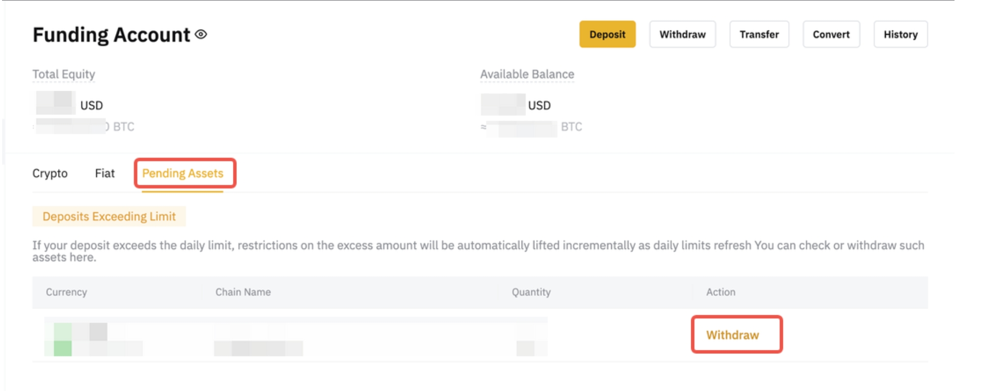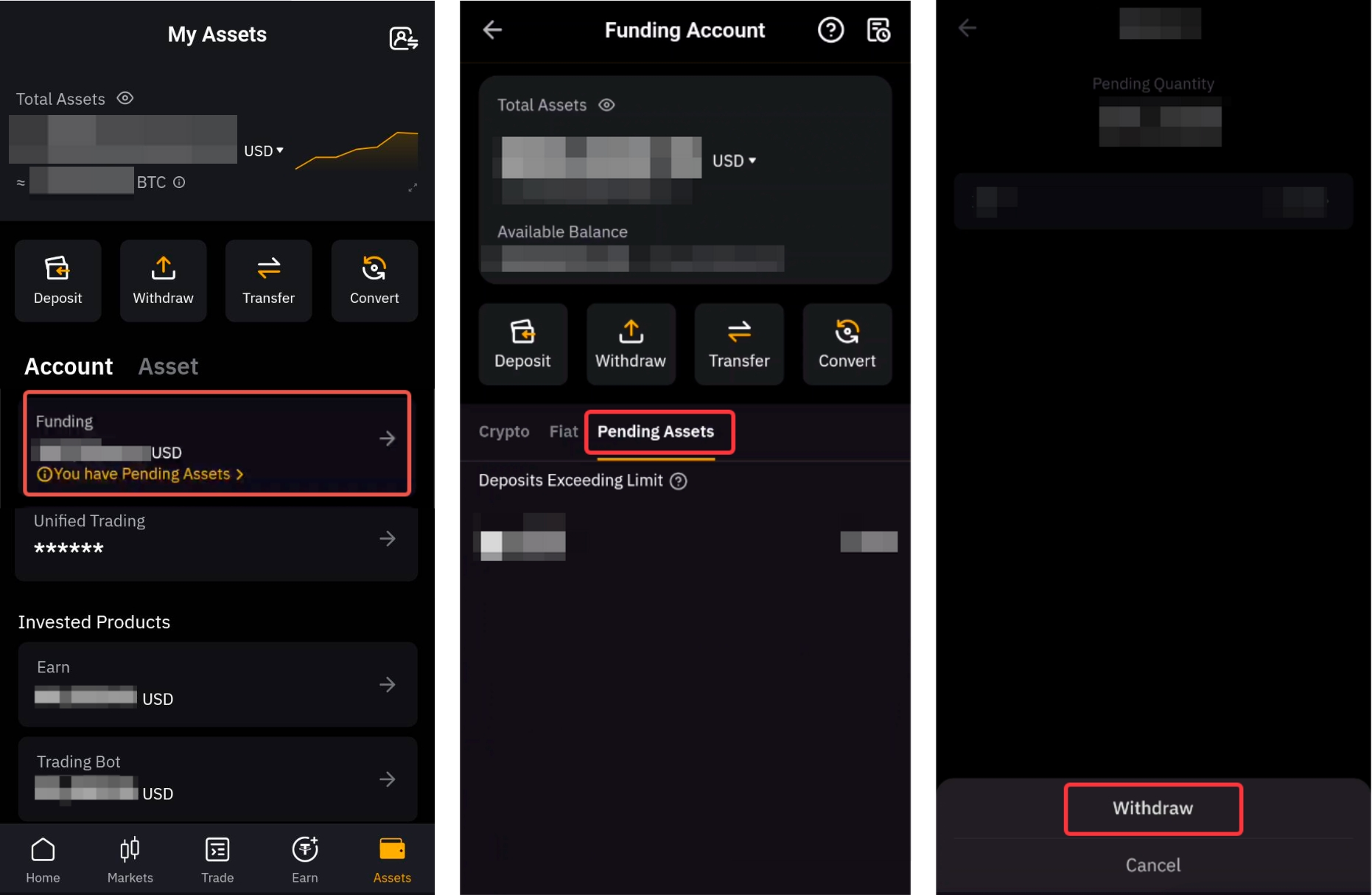 Pending Assets refer to deposits awaiting credit confirmation for a specific blockchain. These deposits require additional time before they can be accessed for trading or withdrawal, in alignment with the deposit credit limit.