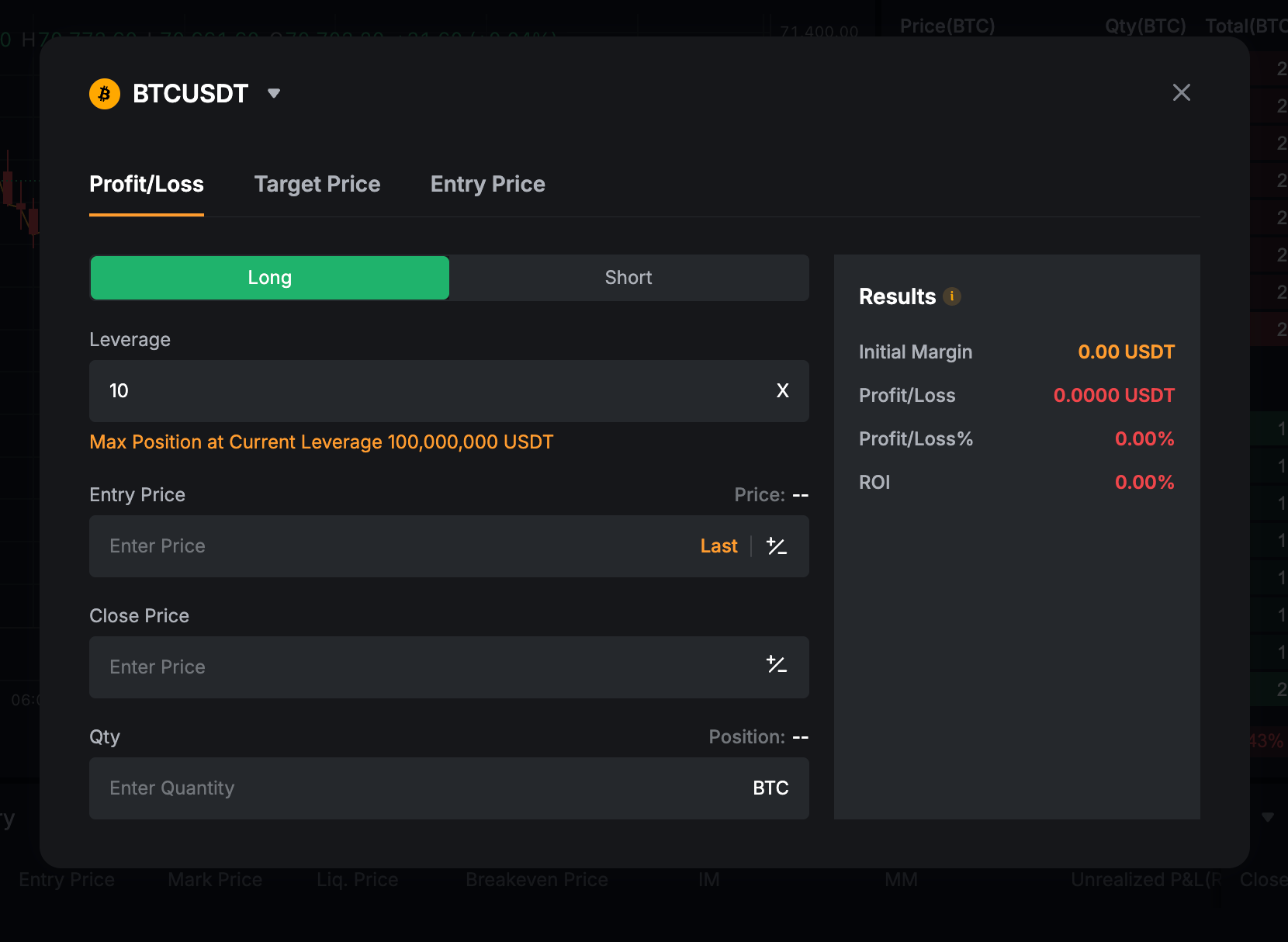 You can calculate the Initial Margin, Profit/Loss, Profit/Loss (%), and ROI (Return of Investment) for your position by entering its Leverage, Contract Quantity, Entry price, and Close price.