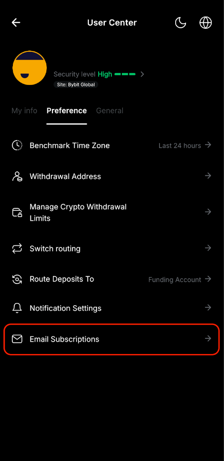 To turn off Bybit’s Email Subscription, you may go to the Settings page by clicking on the profile icon on the top left corner of the homepage and click on the Settings icon. Then, click on Preferences → Email Subscriptions where you can customize which Event Reminders and General Announcements you wish to receive on your registered email address.
