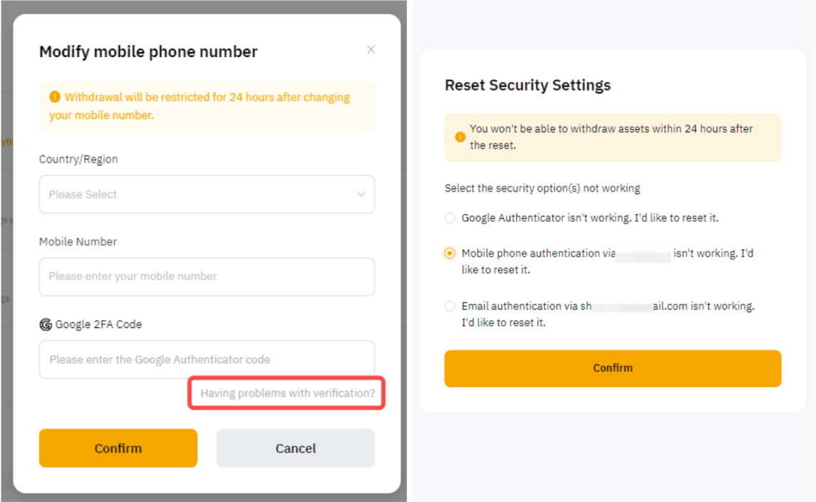 On the 2FA authentication window, you can click on Having problems with verification to select the verification method that is not working. Fill in the information and once your request is approved, our customer support will help you reset your 2FA authentication.
