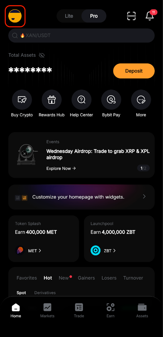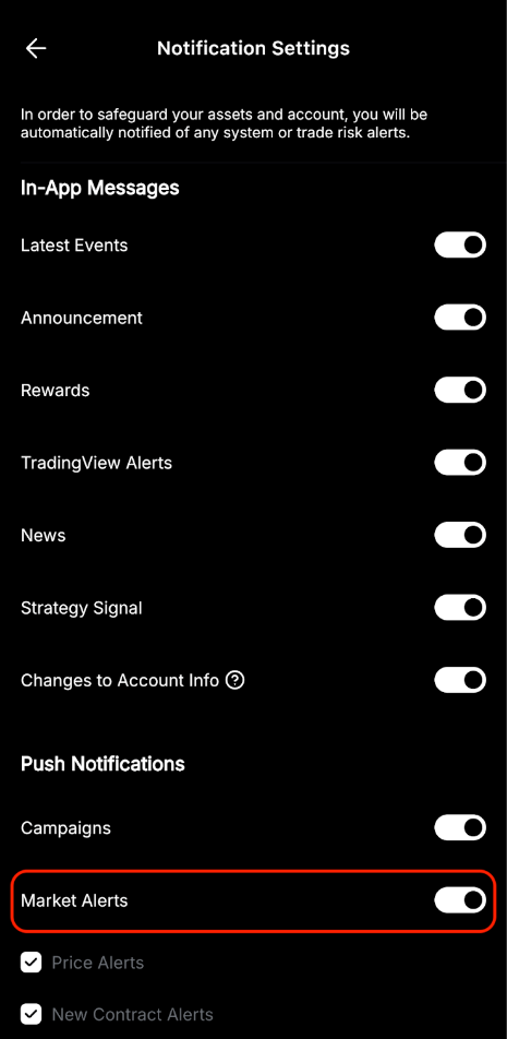 To turn off Bybit’s Market Alerts, you can go to the Settings page by clicking on the profile icon on the top left corner of the homepage and click on the Settings icon. Then, click on Preference → Notification Settings where you can define the type of notifications you want to receive on your phone from the Bybit App.