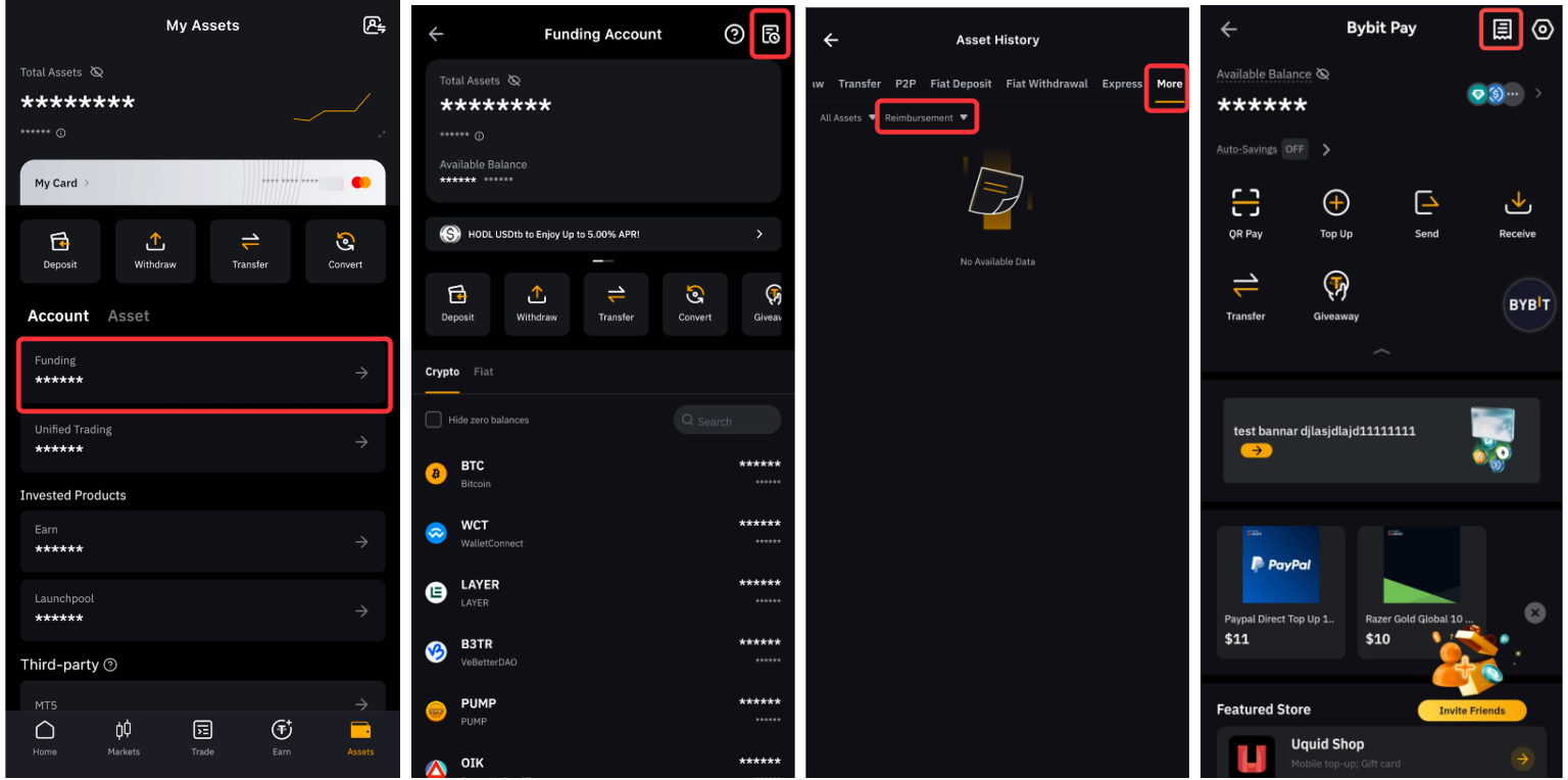 On the app, go to Assets → Funding account → More, then filter the type to Bybit Pay. Alternatively, you may go to the Bybit Pay page and tap on the Paper icon in the top right corner.
