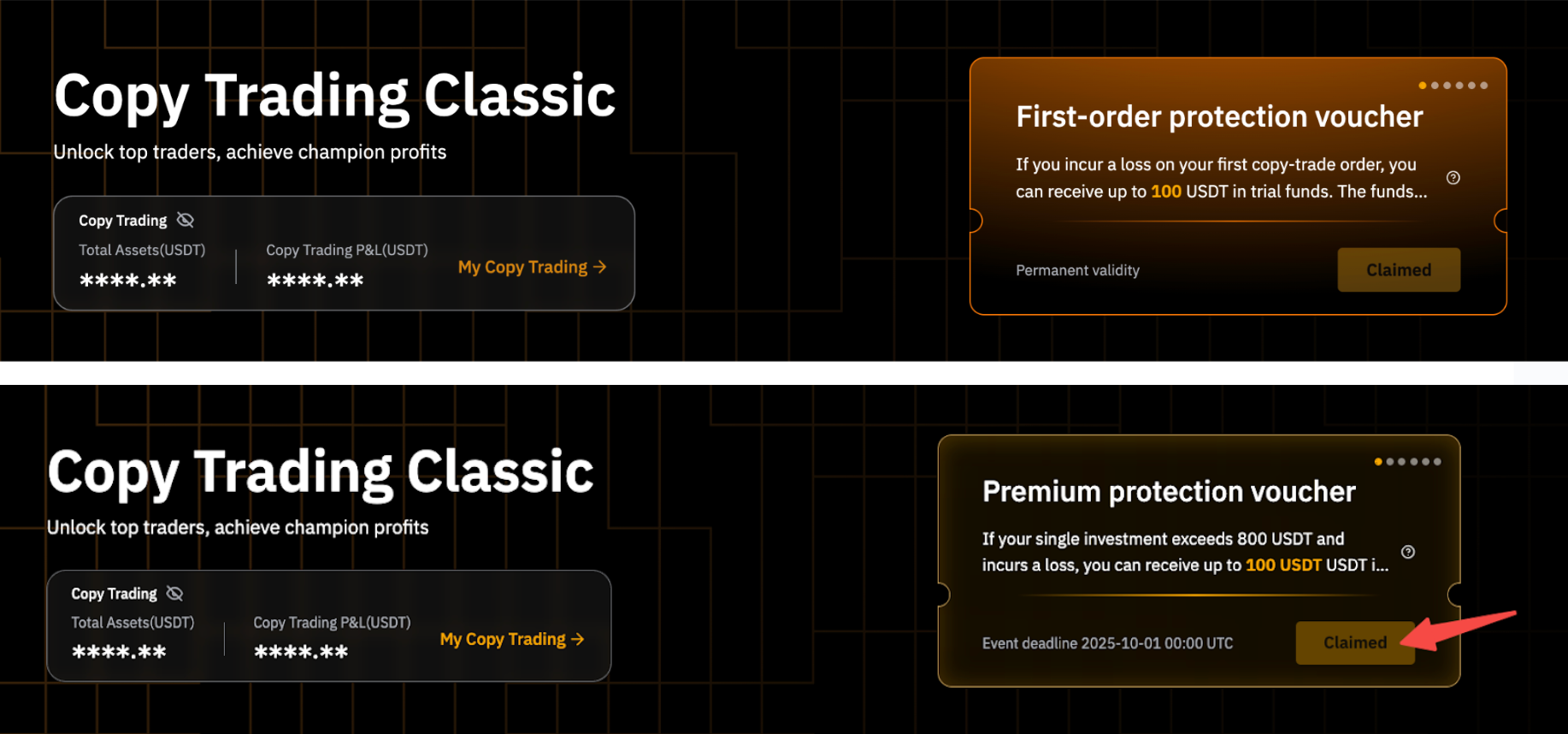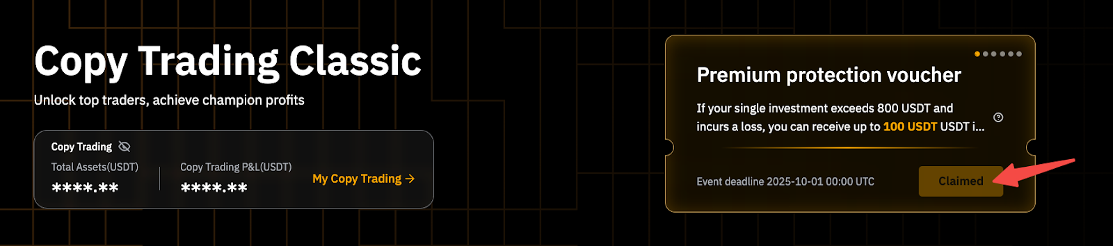 Premium Protection Voucher: It can be claimed once every quarter on the top right corner of Copy Trading Classic or Copy Trading TradFi. Within the same quarter, you're eligible for compensation—up to 100 USDT—for losses from a single eligible Master Trader. This benefit can only be used once per quarter.