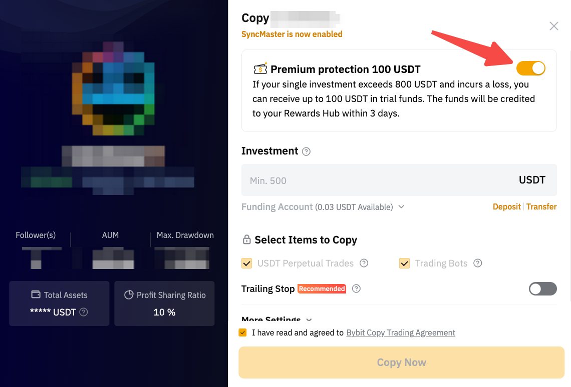 Premium Protection Voucher: Coverage can be applied to the Master Traders where you have turned on the toggle to activate the voucher in the investment window only.