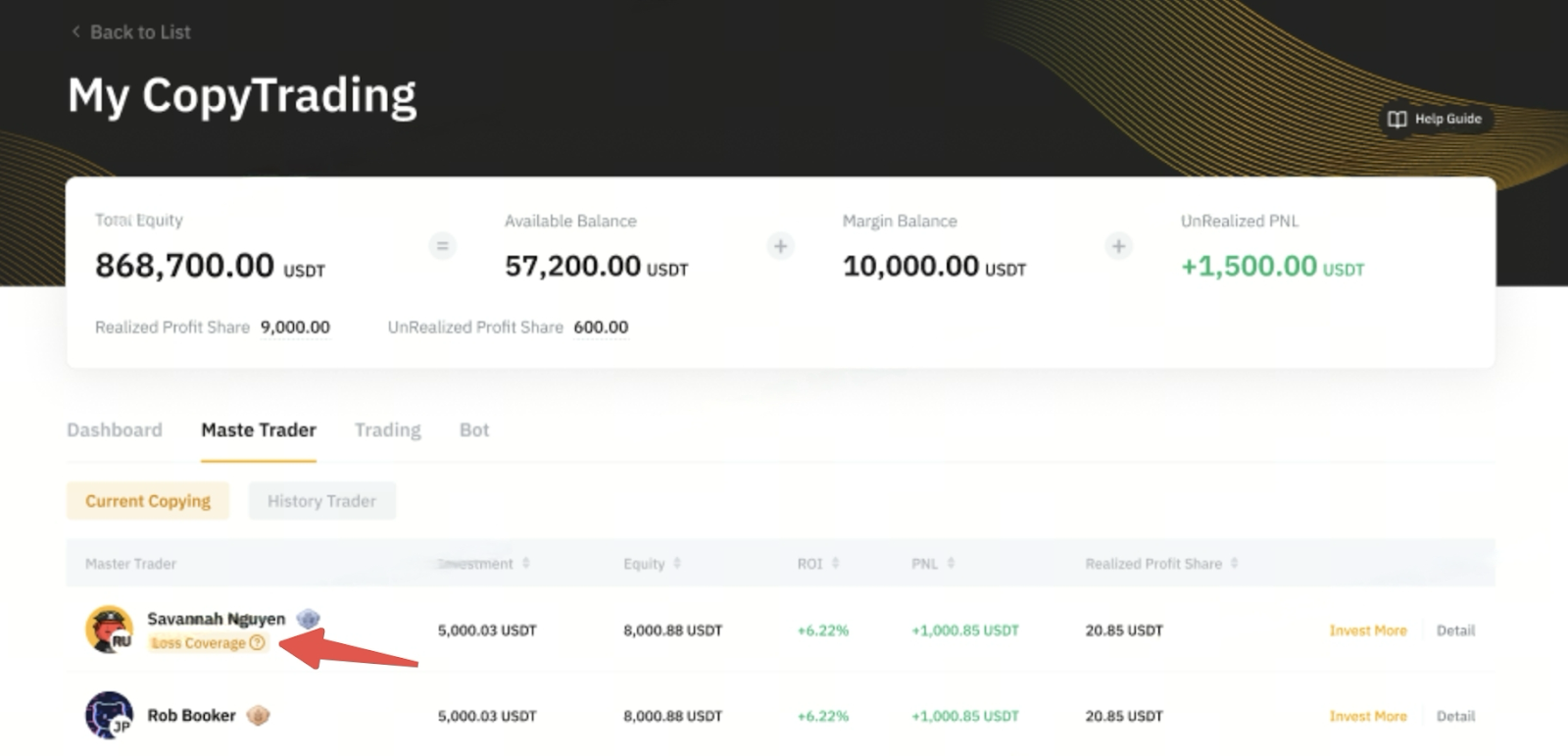 Example : If the first order opened by Master Trader B, even if Master Trader A was copied first, losses up to 100 USDT from Master Trader B’s first order will be compensated.