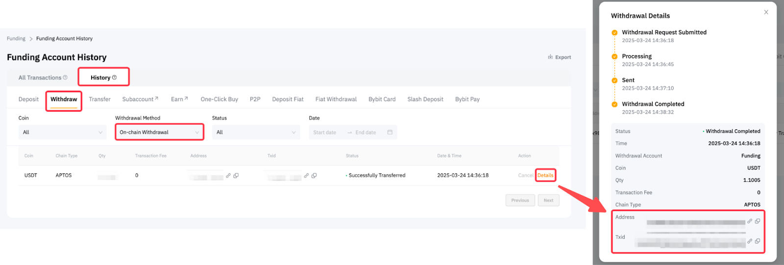 You can get the TXID from the Funding Account History → Withdraw page and click on the details to check your withdrawal address and TXID.