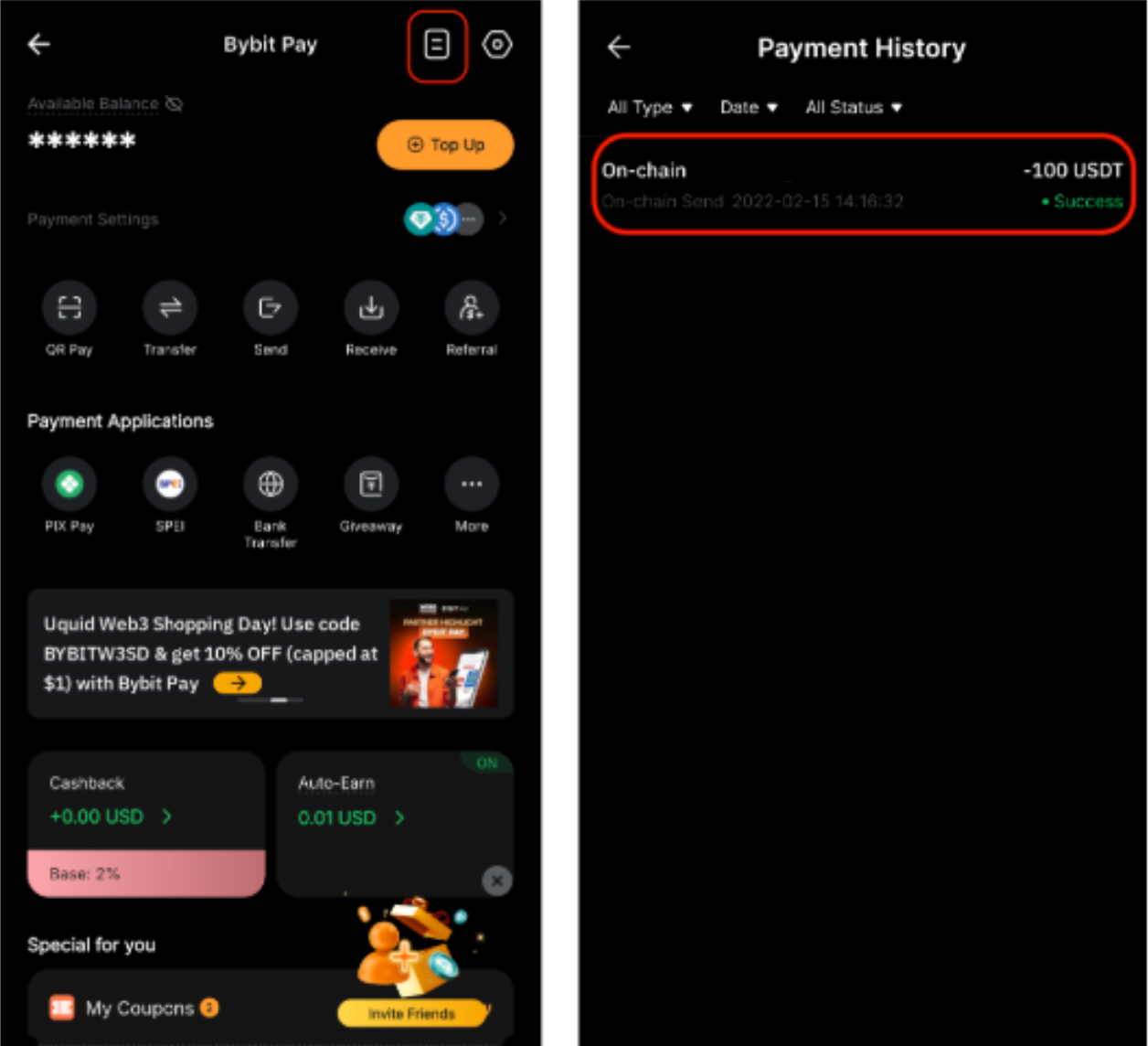Go to the Bybit Pay page and tap the Payment History icon in the upper-right corner.