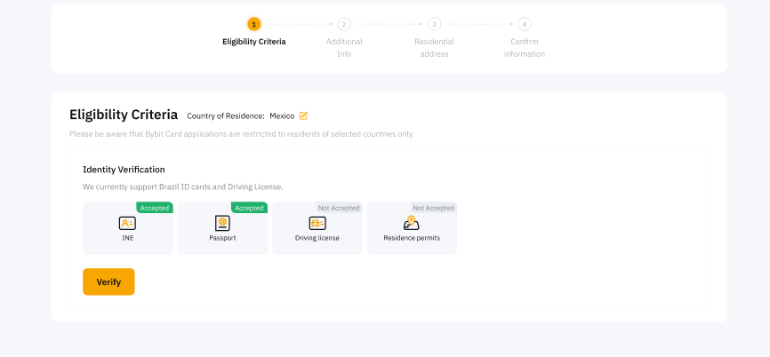 Note: Bybit Card has more stringent requirements for Identity Verification. Hence, you may be required to update your Identity Verification even though you have already completed it on your Bybit account previously.