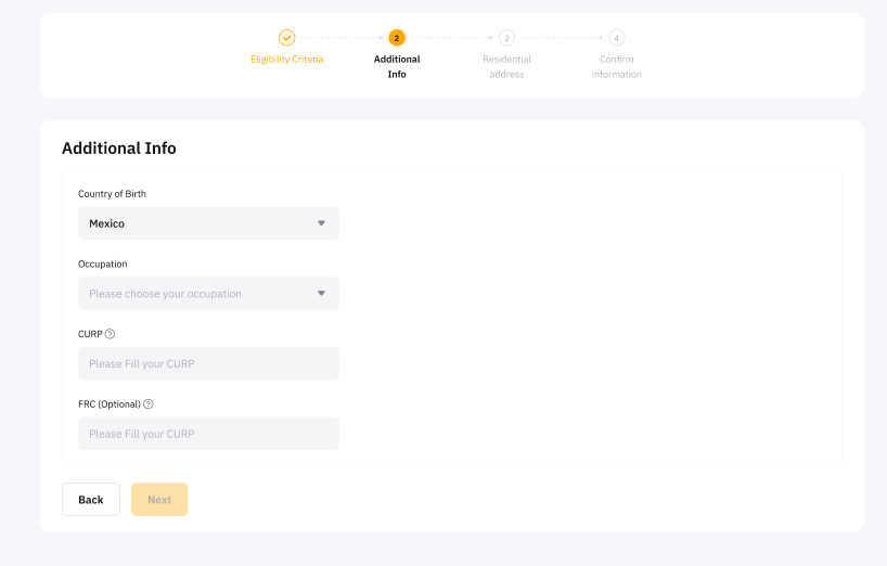 Step 4: Provide additional information about your Country of birth, occupation, CURP and RFC ( Registro Federal de Contibuyentes), if applicable.