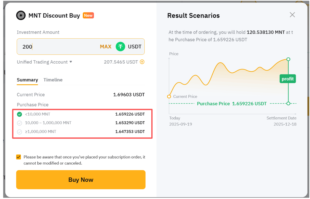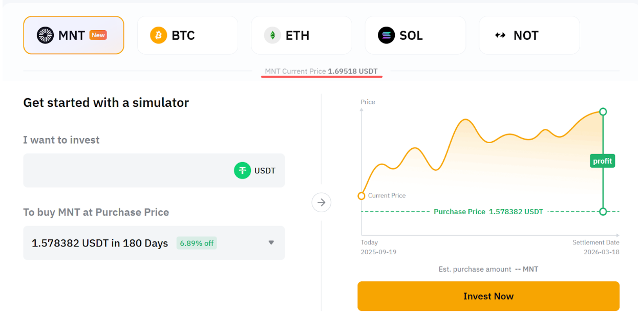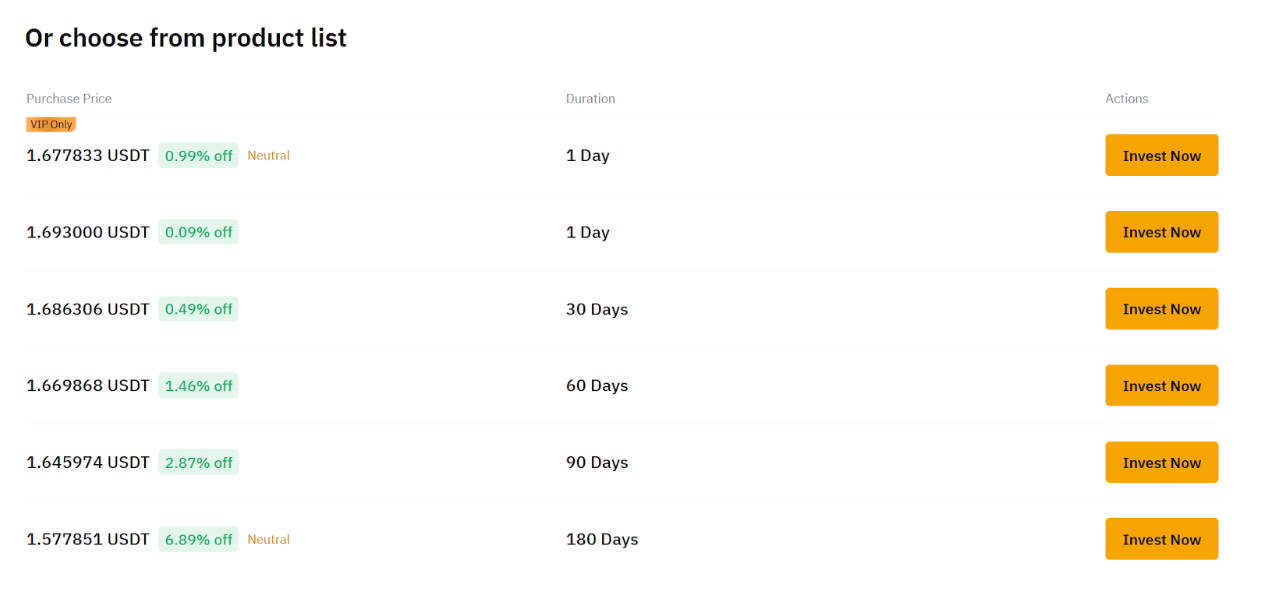 Step 2: Choose a Discount Buy Plan by using the simulator to view available options. Select one based on the token, purchase price, knockout price (if available), and duration, and click Invest Now to continue.