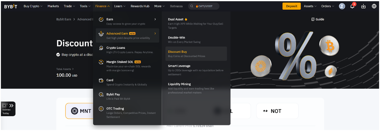 Step 1: Hover your cursor over Finance at the top navigation bar of the Bybit home page. Then click on Advanced Earn → Discount Buy.