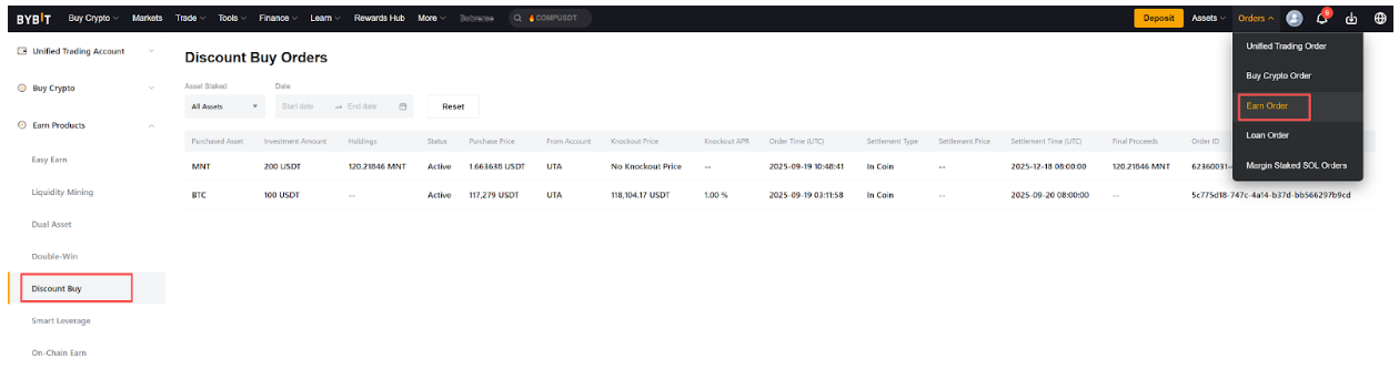 b. Go to Assets → Earn in the top-right corner of the Bybit page. Select the Discount Buy tab to see your orders.