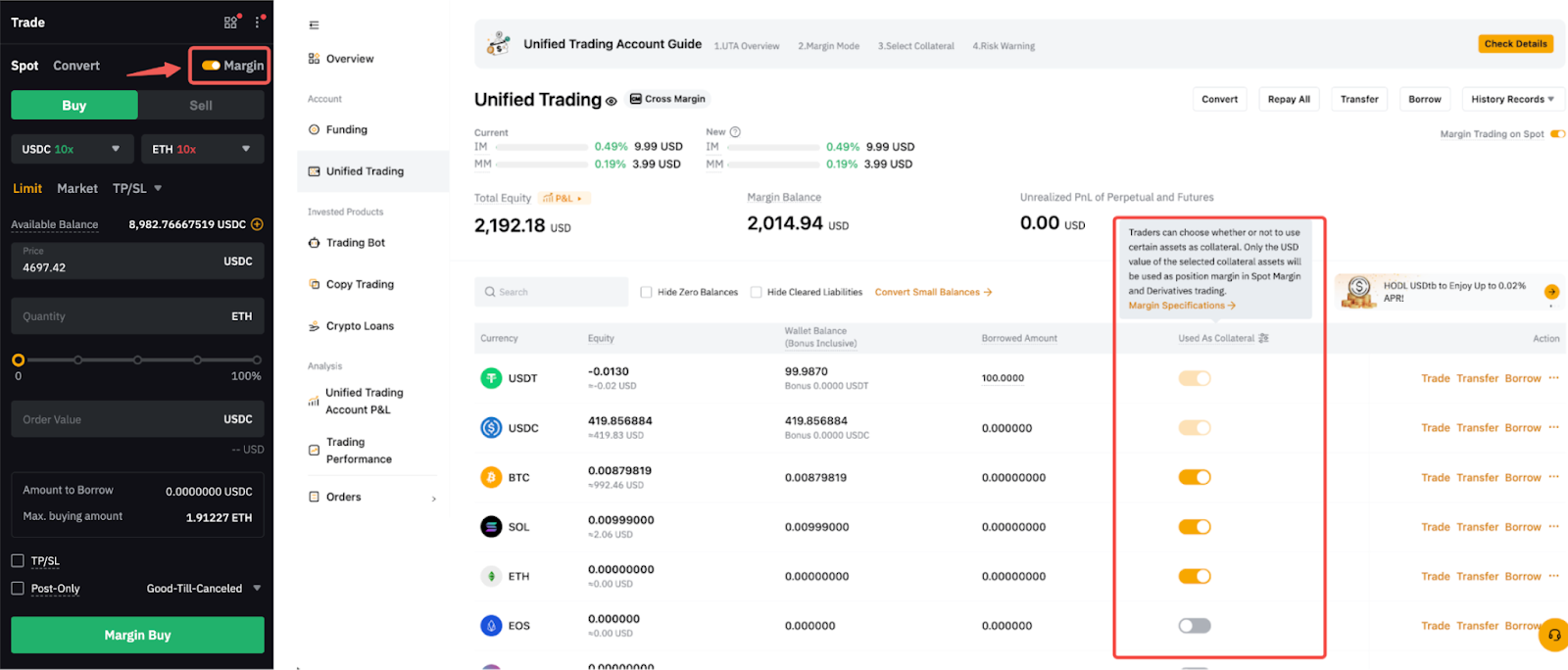 Collateral Requirement: To borrow funds, the asset used in the trading pair must be enabled as collateral. For instance, to trade BTC/USDT, you will need to enable both BTC and USDT as collateral first. To learn more about how to enable assets as collateral, visit here.