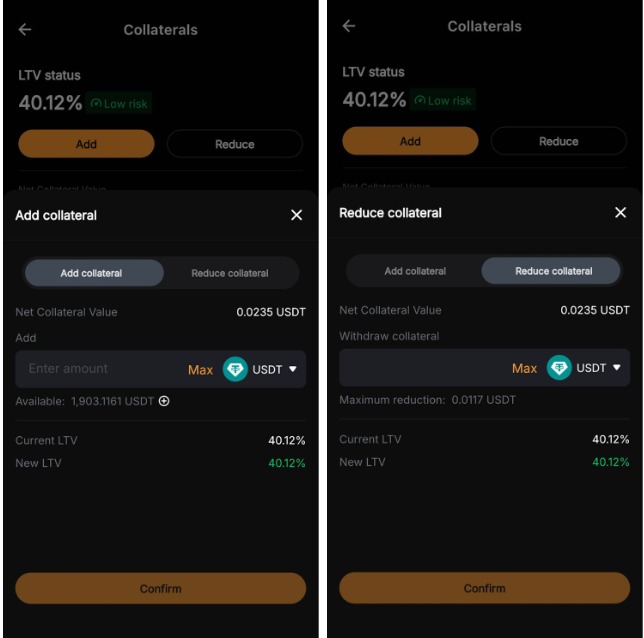 • Add: Opens the Add collateral tab. Choose the collateral token and enter the amount you'd like to add, or tap Max to use the full available balance in your Funding Account. Adding collateral lowers your LTV and reduces liquidation risk.