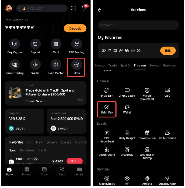 1. The Bybit App homepage: Tap More, find Bybit Pay under Finance, and tap Activate Bybit Pay.