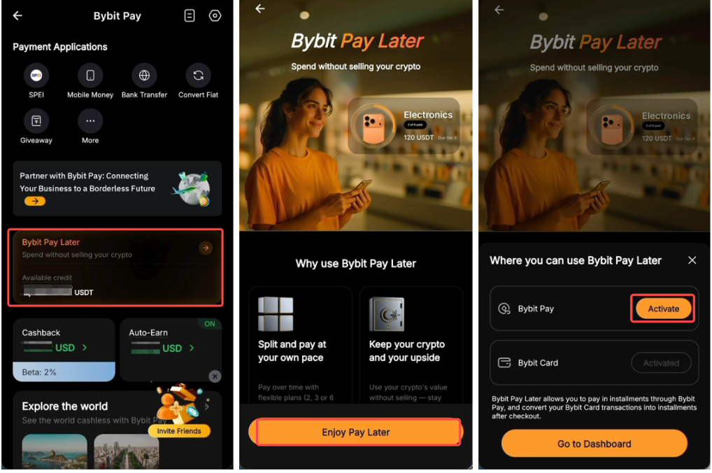 1. The Pay Later homepage (accessible via both the Bybit Card and Bybit Pay homepages): Tap Enjoy Pay Later, then select Activate for Bybit Pay on the pop-up page.