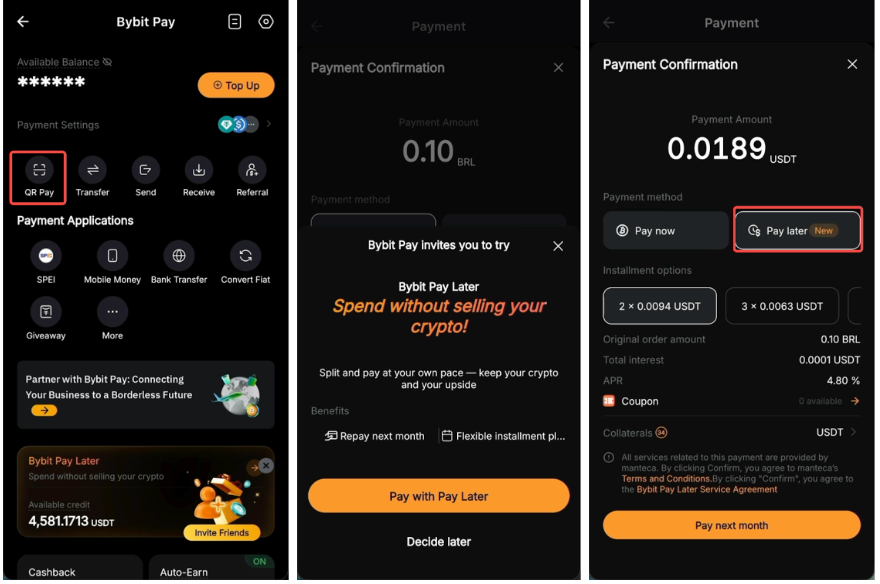 Bybit Pay Later is a financial service that offers short-term liquidity to help you manage your spending more flexibly. When you make a purchase with Bybit Pay, it allows you to borrow funds instantly at checkout and repay them in monthly installments. Please note that Bybit Pay Later is only available on the app. This guide will walk you through how to get started with Pay Later on Bybit Pay.
