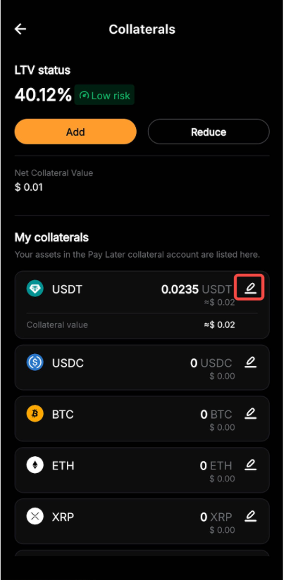 You can also adjust the collateral by tapping the edit icon next to an asset under My collaterals.