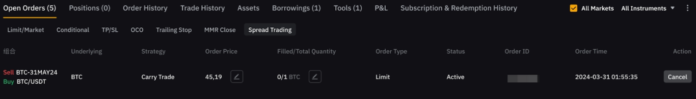 You can also track your orders by clicking Orders → Spread Trading. Switch between Open Orders and Order History to view active or completed orders. To cancel an active order, simply click Cancel under Action.