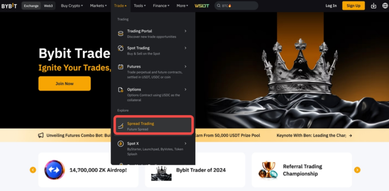 Step 1: Log in to the Bybit website and click Trade → Spread Trading in the navigation bar to access the Spread Trading page.