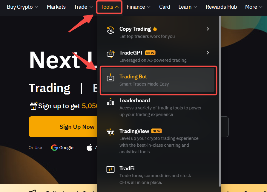 Step 1: Please click on Tools → Trading Bot in the navigation bar to enter the Bybit Trading Bot page.
