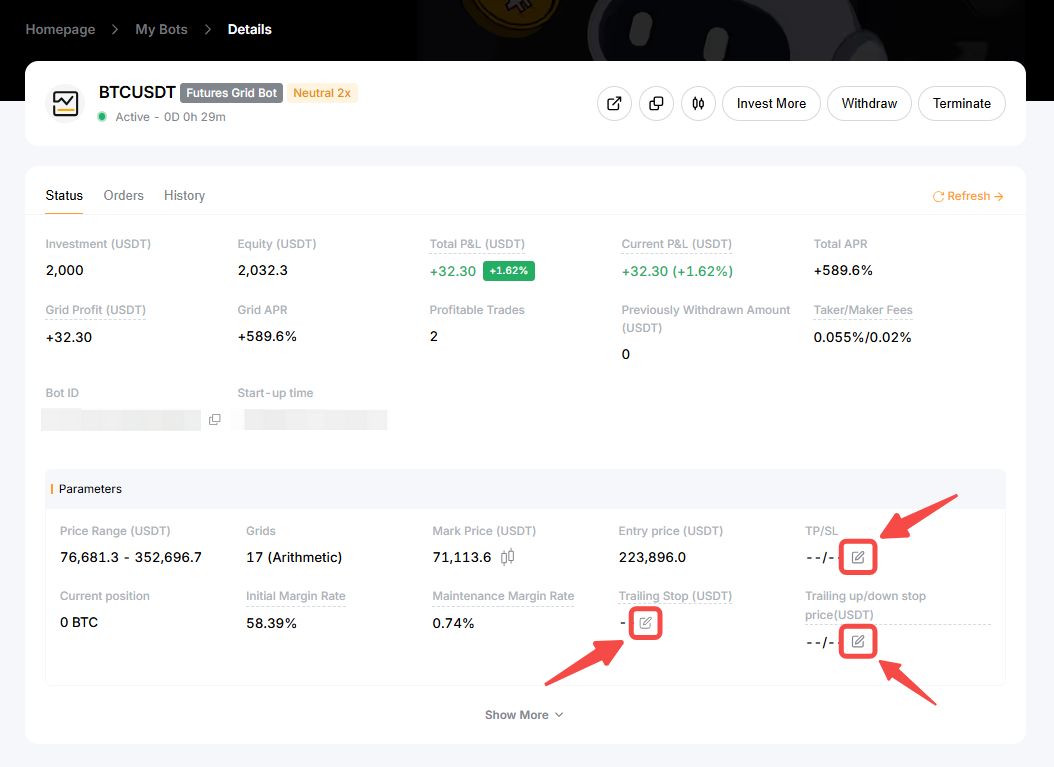 You can also modify the advanced settings of your Futures Grid Bot such as the TP/SL, Trailing Stop and the Trailing up/down Stop Price by clicking on the edit icon next to the relevant fields.