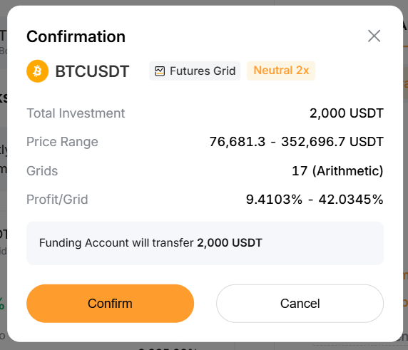 Step 4: Please double-check the grid bot information you’ve created, and then click on Confirm to start trading.