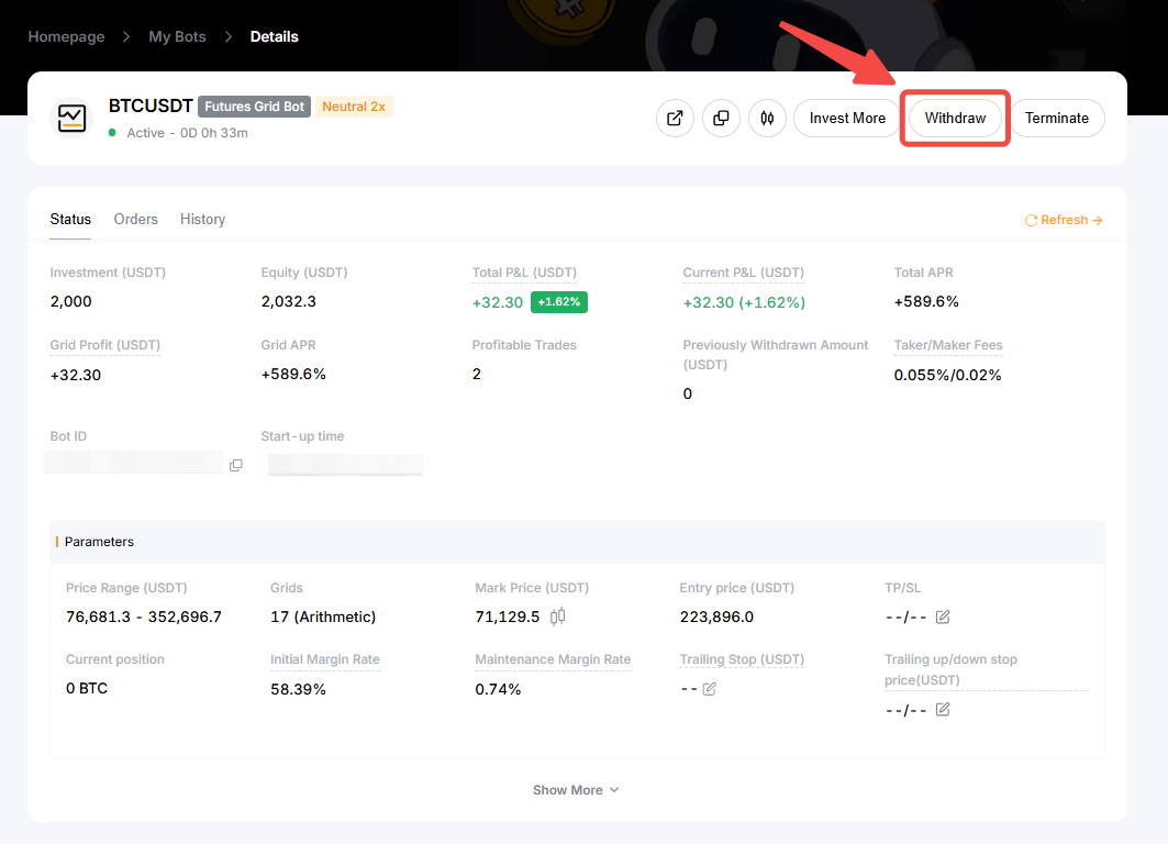 To withdraw your Futures Grid Bot profits, go to your bots Details and click on Withdraw.