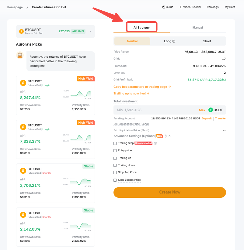 By using AI Strategy, the system will suggest the parameters based on the historical data performance of the Futures trading pair. Alternatively, you can also refer to the suggestion from Aurora’s Picks to create a Futures Grid Bot based on your preferences.