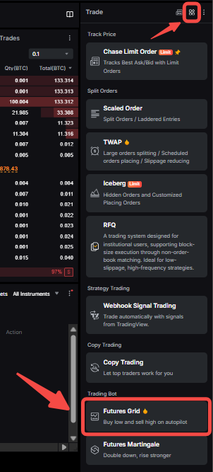 Alternatively, on the Futures Trading page, navigate to the order zone on the right side and select Tools → Futures Grid.