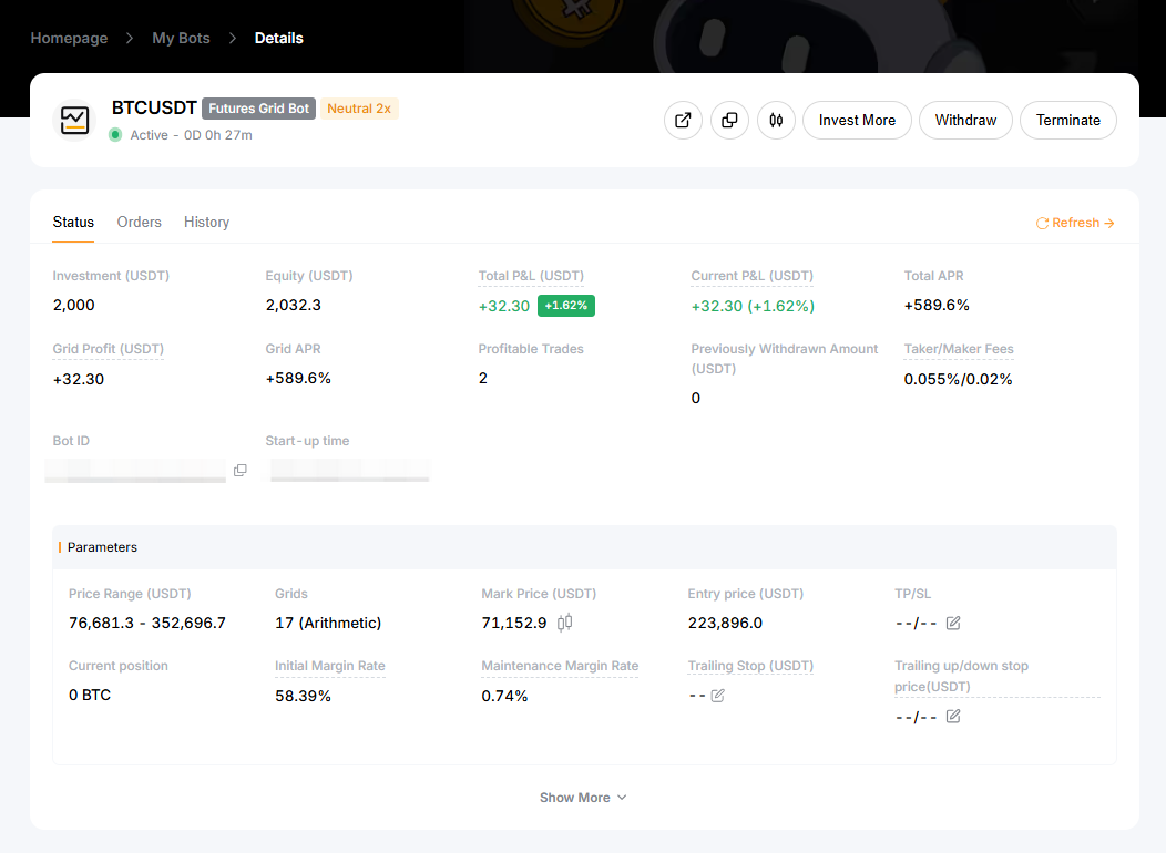 You can click on Details in the upper right corner of the grid bot you wish to view to explore more information, including the current status of your Futures Grid Bot, current orders under the Orders tab, and your order history.