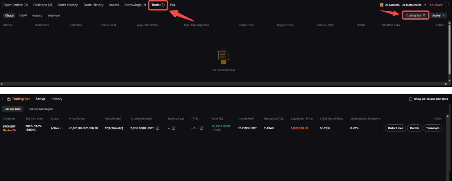 You can also see your active or closed Futures Grid Bot details on the Futures Trading pages by clicking on Tools → Trading Bot.