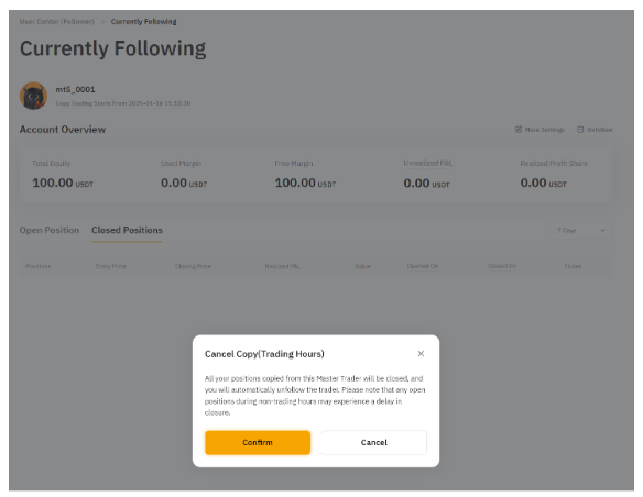 Please note that all your positions copied from this Master Trader will be closed when you unfollow the Master Trader. Please note that any open positions during non-trading hours may experience a delay in closure.